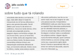 Cocielo até pediu desculpas por sua mensagem e se disse arrependido, mas apenas no Twitter — em seu canal de Youtube, chamado Canal Canalha, com quase 17 milhões de inscritos, não há nenhum vídeo prestando esclarecimentos. Também apagou todos os seus tweets, muitos deles com conteúdos racista ainda mais agressivos. “O Brasil seria mais lindo se não houvesse frescura com piadas racistas. Mas já que é proibido, a única solução é exterminar os negros”, diz em um deles. “Nada contra os negros, tirando a melanina”, comenta em outro. “Eu queria ter gravado um vídeo sobre o dia da consciência negra, só que aí deixei queto porque na cela não tem wi-fi”.