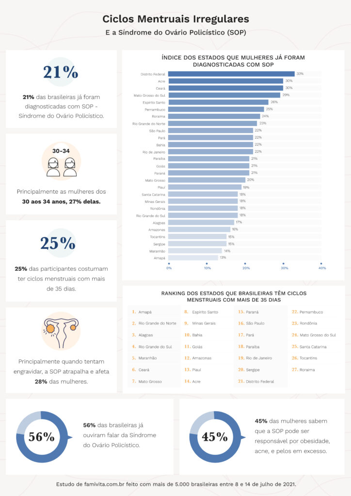 A SOP também causa microcistos em um, ou ambos ovários. E conforme constatou a Famivita em seu mais recente estudo, 21% das brasileiras já foram diagnosticadas com SOP. E os dados por estado demonstram que, o Distrito Federal é o estado em que mais mulheres já foram diagnosticadas, com 33% das participantes. Em São Paulo e no Rio de Janeiro, 22% das participantes possuem o diagnóstico. E o Amapá é o estado com o menor percentual de diagnósticos de SOP, 13% das entrevistadas.