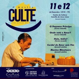 A CazAzul Teatro Escola realiza, nos dias 11 (terça-feira) e 12 (quarta), a 4ª Mostra Culte, com apresentação de espetáculo teatrais para todas as idades. O evento será no Centro de Cultura Camillo de Jesus Lima, às 19h. A entrada é franca!