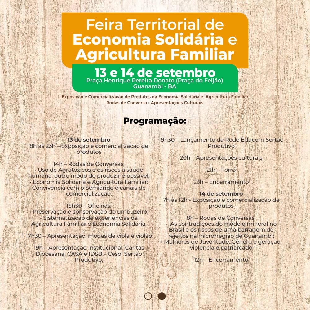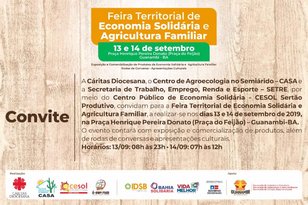O evento é uma realização da Cáritas Diocesana, do Centro de Agroecologia no Semiárido (CASA), e da Secretaria do Trabalho, Emprego, Renda e Esporte (SETRE), por meio do Cesol Sertão Produtivo e do Instituto de Desenvolvimento Sustentável Baiano. Confira a programação completa:
