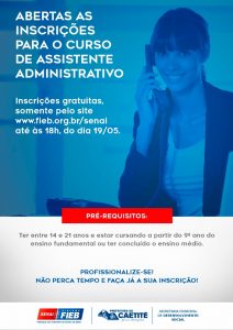 Gerir e organizar a logística, o marketing e as finanças, atender às solicitações de clientes: essas são algumas das tarefas desempenhadas pelo assistente administrativo. Com o objetivo de capacitar profissionais para essas atividades, o Senai em parceria com a Prefeitura de Caetité, por meio da Secretaria de Desenvolvimento Social, abrem as inscrições para o curso Assistente Administrativo.