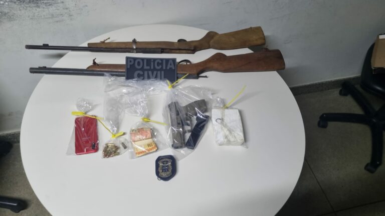 Após ser desarmado, o homem permitiu a entrada dos policiais civis em sua residência. No interior do imóvel, os investigadores confirmaram as informações fornecidas por ele e apreenderam duas espingardas e porções de cocaína.