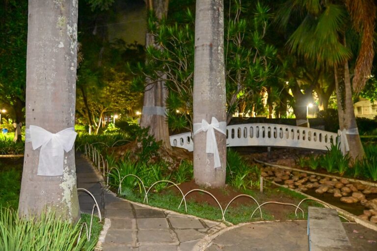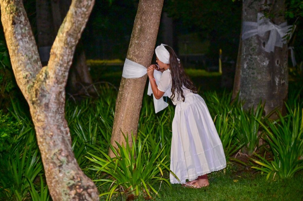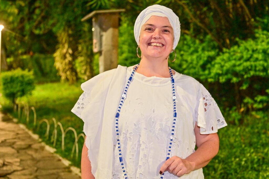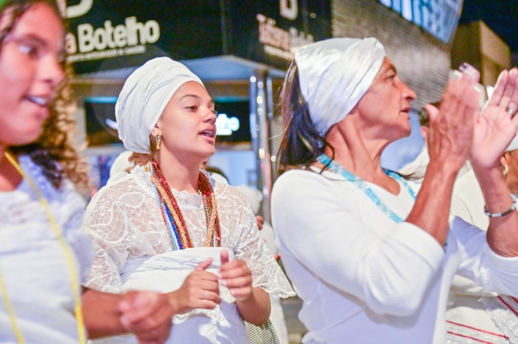 A cerimônia teve início com o Xirê dos Orixás, ritual das religiões afro-brasileiras que reverencia os ancestrais por meio de cânticos e toques, chamando as divindades do povo do Axé. Em seguida, foram distribuídos os Ojás– laços brancos amarrados nas árvores da Praça – como símbolo de paz, respeito e enfrentamento ao racismo religioso.
