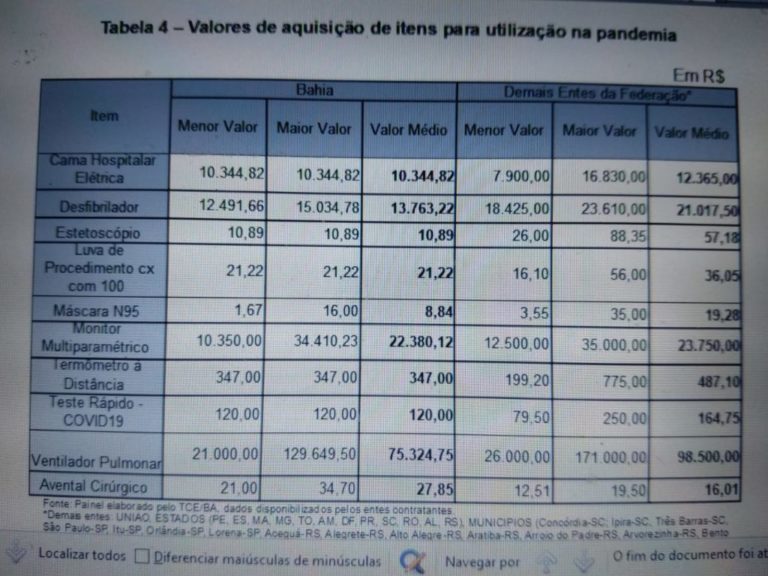Já sobre as aquisições de itens de uso médico e hospitalar, os preços médios da Bahia têm ficado abaixo da média dos demais entes da Federação. Por outro lado, a auditoria identificou falhas na transparência das despesas com a Covid-19, já que o Estado da Bahia não vem cumprindo integralmente a Lei Federal nº 13.979/2020, pois até o momento o portal destinado à transparência das despesas da pandemia não contém todas as contratações realizadas, a divulgação demora para ser feita e o site não permite a gravação em meio eletrônico das informações disponibilizadas.