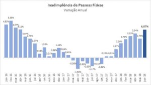 A lenta recuperação econômica não tem colaborado para a queda da inadimplência no país. De acordo com dados apurados pelo Serviço de Proteção ao Crédito (SPC Brasil) e pela Confederação Nacional de Dirigentes Lojistas (CNDL), o volume de consumidores com contas em atraso e registrados em cadastros de devedores acelerou no último mês de junho, ao crescer 4,07% na comparação com o mesmo período do ano passado. Trata-se da nona alta consecutiva na série histórica do indicador. A última vez que a inadimplência apresentou recuou foi em novembro de 2017 (-0,89%). Ao todo, o SPC Brasil e a CNDL estimam que o país concluiu o primeiro semestre deste ano com aproximadamente 63,6 milhões de brasileiros com o CPF restrito em virtude de atrasos no pagamento de contas. Esse dado representa 42% da população adulta do país.