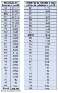 Segundo estudo da Serasa Experian, os brasileiros sofreram 283.051 tentativas de fraude de identidade em novembro de 2022, o que representa 1.315 tentativas a cada um milhão de habitantes. No ranking estadual, o Distrito Federal apareceu em primeiro lugar, com 2.175 tentativas a cada um milhão de habitantes. São Paulo, que foi o Estado com o maior número de tentativas em novembro (87.117), apareceu em 2º lugar, com 1.849 tentativas a cada um milhão de habitantes. Além do Distrito Federal e São Paulo, outros sete Estados estão com resultados acima da média nacional. Veja na tabela abaixo as informações completas: