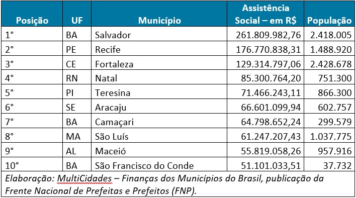 Os seis primeiros lugares do ranking são ocupados pelas capitais da região. Salvador (BA) aparece no topo, com R$ 261,8 milhões investidos em assistência social, em 2022. Na sequência estão Recife (PE), com R$ 176,8 milhões; Fortaleza (CE), com R$ 129,3 milhões; Natal (RN), com R$ 85,3 milhões; Teresina (PI), com R$ 71,5 milhões; e Aracaju (SE), com R$ 66,6 milhões.