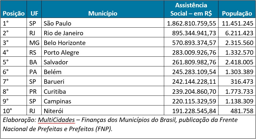 RANKING – AS 10 MAIORES DESPESAS MUNICIPAIS COM ASSISTÊNCIA SOCIAL DO PAÍS EM 2022