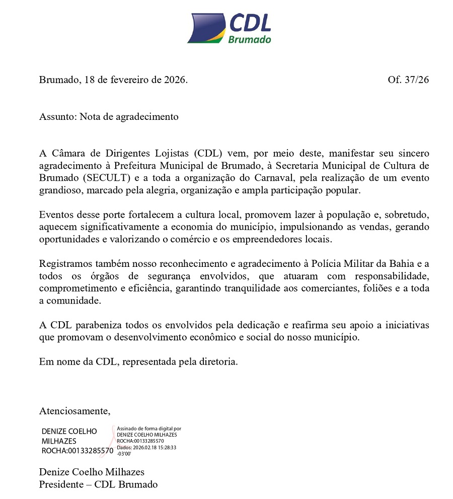 A Câmara de Dirigentes Lojistas de Brumado (CDL) divulgou nesta quarta-feira (18) uma Nota Oficial de Agradecimento à Prefeitura Municipal, à Secretaria Municipal de Cultura, Esporte e Lazer e toda a equipe envolvida na organização pelo sucesso do Carna Brumas 2026, evento que movimentou a cidade durante o período carnavalesco.