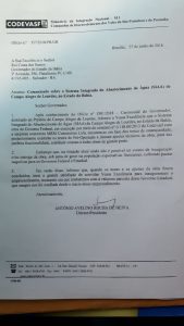 A Companhia de Desenvolvimento dos Vales do São Francisco e Parnaíba (Codevasf), autarquia vinculada ao Ministério da Integração Nacional, encaminhou oficio subscrito pelo seu presidente, Antônio Avelino Rocha de Neiva, na quinta-feira (28 de junho), ao governador Rui Costa dos Santos (PT), datado de 27 de junho, destacando a inoportunidade, por razões técnicas e para evitar que a população pudesse ter que a inauguração do Sistema Integrado de Abastecimento de Água de Campo Alegre de Lourdes, no Norte do Estado.