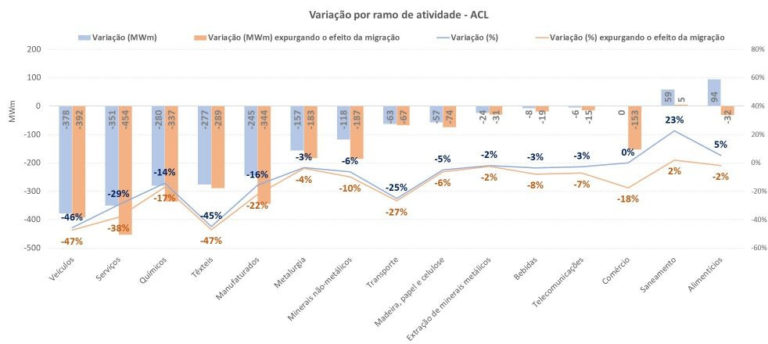 Entre os principais ramos de atividade que consomem energia no Ambiente de Contratação Livre – ACL, a indústria automotiva e o segmento têxtil continuam liderando o ranking de redução da demanda. O consumo de ambos recuou 47%. Já o setor de serviços está na terceira posição, com queda de 38% em comparação com o mesmo mês de 2019. Os valores já expurgam os efeitos de migrações de consumidores que passaram a negociar no mercado livre.