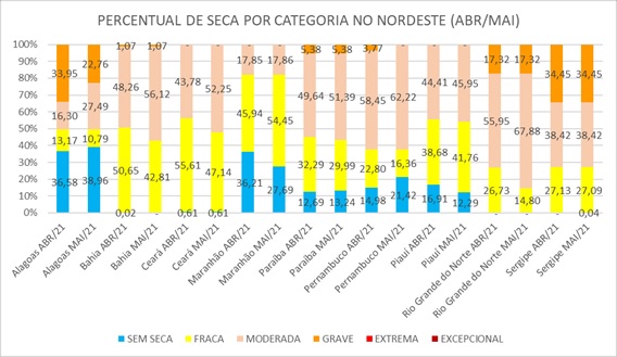 Em maio a severidade da seca se manteve estável em Sergipe nos patamares de 27% de seca fraca, 38% de seca moderada e 34% de seca grave, devido às chuvas dentro da normalidade. Assim, o estado registrou a maior área com seca grave e a condição mais severa do fenômeno em maio no Nordeste. Desde outubro de 2020, Sergipe passa por seca em todo o seu território.
