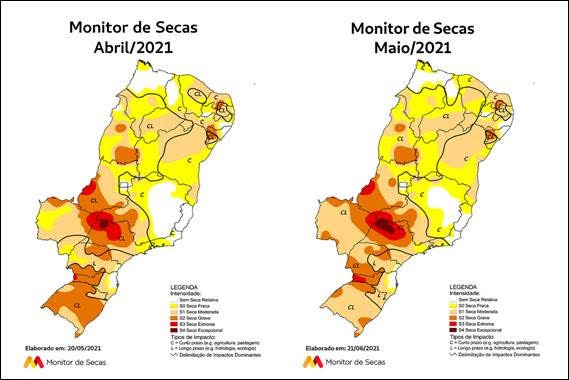 A Bahia registrou um aumento da área com seca moderada, que passou de 48% em abril para 56% de seu território em maio sobretudo em parte da região central e faixa leste do estado, devido às chuvas abaixo da média nos últimos meses. Desde março deste ano, 100% da Bahia passa por seca. Em maio a Bahia teve a maior área total com seca entre as 20 unidades da Federação acompanhadas pelo Monitor: 567 mil km².