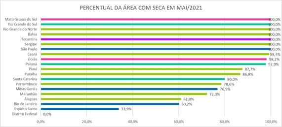 Em sete estados, 100% de seus territórios registraram seca em maio na comparação com abril: Bahia, Mato Grosso do Sul, Rio Grande do Norte, Rio Grande do Sul, São Paulo, Sergipe e Tocantins. Outros três estados registraram entre 97 e 99,5% de área com seca: Ceará, Goiás e Paraná. Exceto o DF, as demais nove unidades da Federação acompanhadas pelo Monitor apresentam entre 33% e 88% de suas áreas com o fenômeno.
