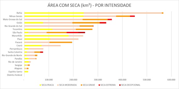 Com base no território de cada unidade da Federação acompanhada, a Bahia lidera a área total com seca, seguida por Minas Gerais e Mato Grosso do Sul, como ilustra o gráfico a seguir.