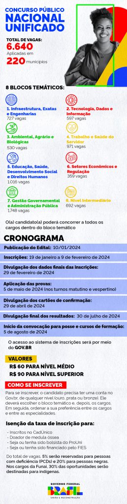 UMA PARA TODOS — As vagas do Concurso Nacional Unificado são divididas em oito blocos temáticos, com oportunidades para candidatos de nível médio e superior. Uma única inscrição vale para concorrer a um posto em mais de um órgão, desde que dentro do mesmo bloco temático. Ao concorrer a mais de um cargo, o candidato deve classificar as vagas de interesse por ordem de preferência para definir a prioridade em uma possível chamada, que será baseada na nota alcançada. A inspiração para o modelo do concurso unificado é o Exame Nacional do Ensino Médio (Enem), que já esteve em 1.727 municípios com aproximadamente 5,1 milhões de inscritos. O CPNU conta com a participação ativa dos órgãos de controle desde o lançamento do certame.