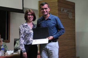 Plinio Murilo, vencedor da edição de 2018, recebe o prêmio das mãos da diretora do ICMC, Maria Cristina Oliveira. Foto: Denise Casatti – ICMC/USP.