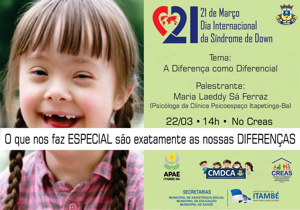 21 de março é comemorado o Dia Internacional da Síndrome de Down e, para celebrar a data, a Prefeitura de Itambé estará realizando nesta sexta-feira (22) uma palestra com o tema: “A diferença como diferencial”.
