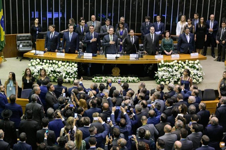 No Plenário, a solenidade foi aberta às 15h02 pelo senador Eunício Oliveira. O parlamentar declarou os dois empossados para o período de 2019 a 2022. Em seguida, o primeiro-secretário do Congresso, deputado Giacobo, leu o termo de posse, que posteriormente foi assinado pelos novos presidente e vice.