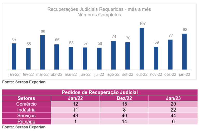 Dados do Indicador de Falências e Recuperações Judiciais da Serasa Experian mostram que, em janeiro, foram registrados 92 pedidos de recuperação judicial no Brasil, um crescimento de 37,3% em comparação com o mesmo mês de 2022. As empresas do setor de Serviços foram as responsáveis pelo maior volume das requisições (44). Para o economista Luiz Rabi, “o crescimento dos números é o segundo estágio da dificuldade financeira das companhias, sendo a inadimplência o primeiro e que já registra o recorde histórico de 6,44 milhões de CNPJs no vermelho em dezembro de 2022”. Confira a seguir o gráfico e a tabela com dados completos: |