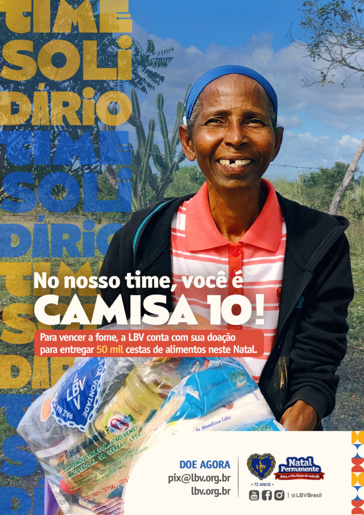 Sempre em campo nessa luta, a Legião da Boa Vontade (LBV) convoca você para reforçar seu time solidário em busca de mais uma vitória: o fim da fome no Brasil. Dessa forma, a Instituição lança a sua tradicional campanha Natal Permanente da LBV — Jesus, o Pão Nosso de cada dia! Juntos podemos acabar com a pobreza e as desigualdades sociais.