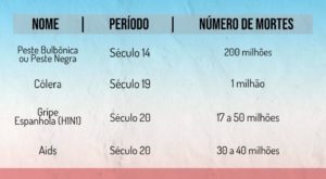 Além disso, Lyra ressalta que as pandemias não são oriundas exclusivamente de vírus. Algumas, ocasionadas por bactérias e microorganismos, também causam grandes estragos na sociedade. Como é o caso da “Peste Bubônica, que recebeu o nome de Peste Negra. É uma doença transmitida para os seres humanos por meio de pulgas de ratos contaminados com a bactéria Yersiniapestis”. Segundo a professora, as investigações apontam que a doença tenha sido originada na China ou em alguma região da Ásia Central, chegando à Europa no século 14.