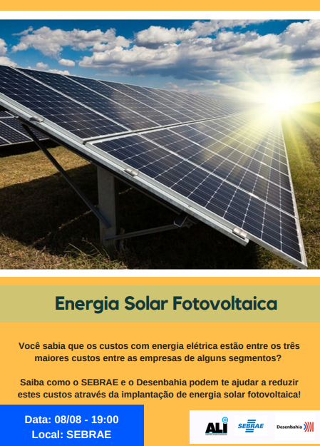 Na palestra, direcionada a micro e pequenas empresas, será apresentada a consultoria do Sebraetec específica para a Energia Solar Fotovoltaica. Nesta consultoria, o Sebrae vai elaborar o projeto, que será atendido pelo Sebraetec, programa que subsidia em até 70% a consultoria para ações inovadoras. No encontro, também serão apresentadas pelo Desenbahia as linhas de financiamento voltadas para a implementação das usinas solares, e haverá ainda a apresentação da empresa Solachio, especializada no desenvolvimento de projetos