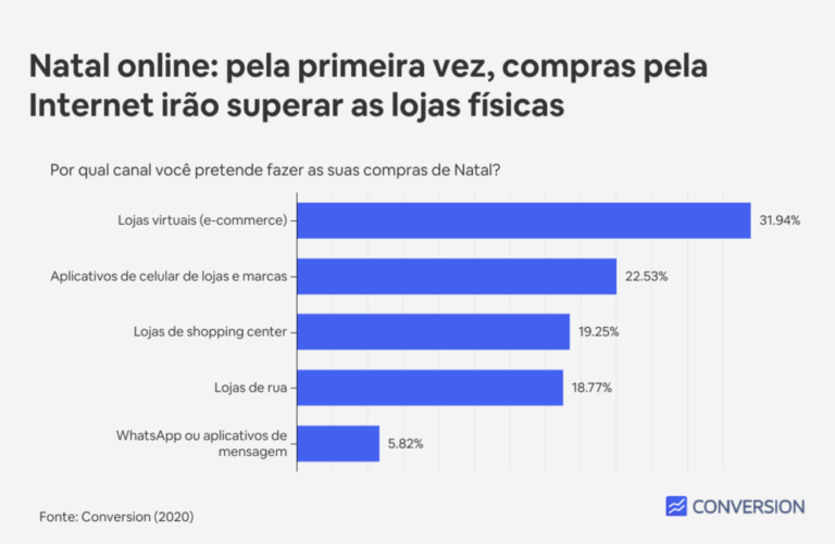 Pela primeira vez no País, o Natal deste ano terá mais compras pela internet do que no varejo físico. Segundo pesquisa inédita da agência Conversion, especializada em SEO e e-commerce, as lojas virtuais somam 31,94% das intenções de compra dos brasileiros para a data, seguidas pelos aplicativos de lojas e marcas, com 22,53%. Os estabelecimentos em shopping centers e comércio de rua aparecem em seguida com, respectivamente, 19,25% e 18,77% das preferências.