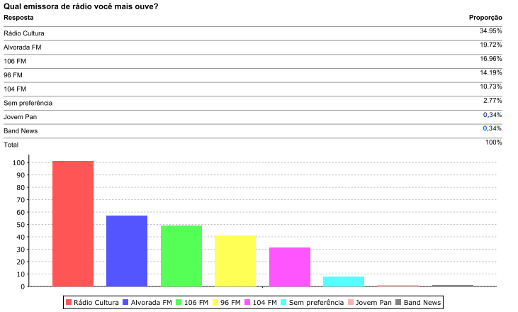 a emissora que mais ouvem é a Rádio Cultura, seguida pela Rádio Alvorada, com 19,72%. As Rádios 106FM,