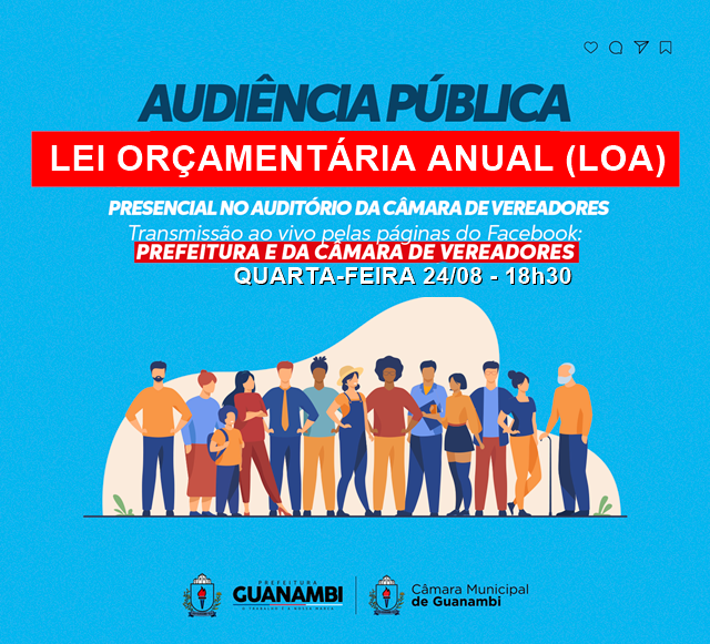 A Prefeitura de Guanambi e a Câmara de Vereadores realizarão a segunda Audiência Pública sobre a Lei Orçamentária Anual (LOA), a ser realizada na próxima quarta (24), às 18h30, no Auditório da Câmara Municipal, com transmissão ao vivo pela página oficial no Facebook.