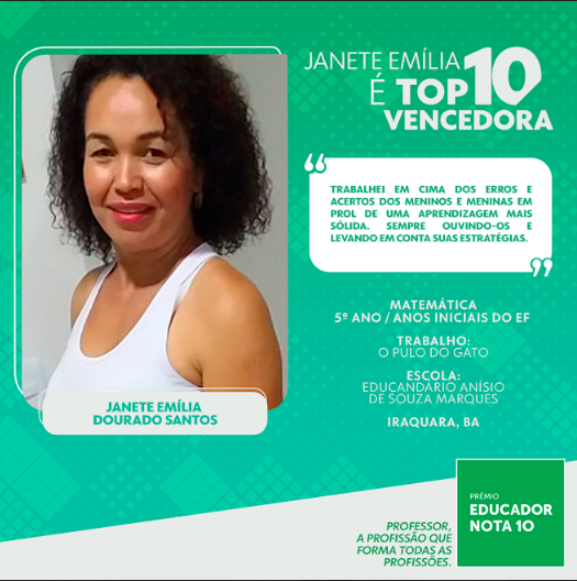 O Prêmio Educador Nota 10, maior e mais importante prêmio da Educação Básica Brasileira, divulgou os dez vencedores da 24ª edição. Depois de muita espera, os premiados foram anunciados nas redes sociais oficiais da premiação e de seus parceiros no dia 24 de fevereiro. Entre os escolhidos está Janete Emília Dourado Santos, professora de Matemática do Educandário Anísio de Souza Marques, em Iraquara (BA). Janete ganha um vale-presente no valor de R$ 15 mil e segue na disputa pelo título de Educadora do Ano.