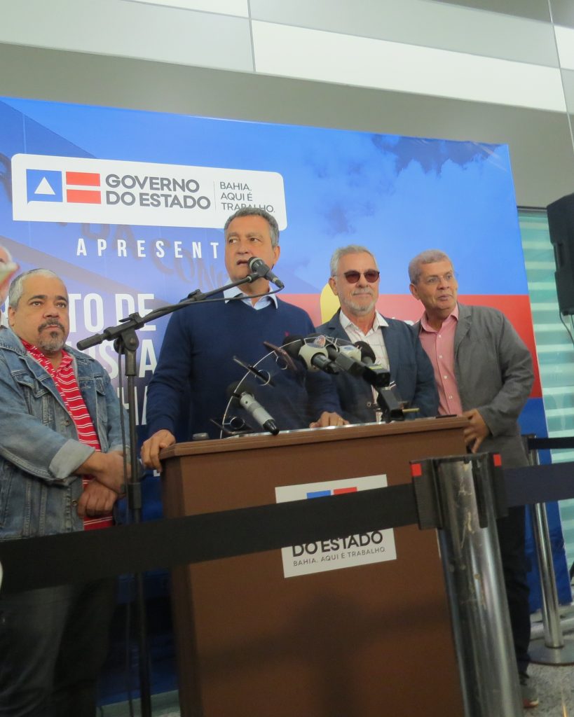 O governador Rui Costa fez questão de decolar com toda a sua equipe do novo Aeroporto Glauber Rocha, partindo para a cidade de Ilhéus, a fim de participar da abertura do Festival Internacional do Chocolate, e também de afirmar que na próxima terça-feira, dia 23, dividirá o palanque da inauguração com Jair Messias Bolsonaro. “Pra mim não tem polêmica nenhuma, eu separo as coisas. Se depender da minha parte eu serei sempre profissional, e cuidarei e colocarei os interesses do povo da Bahia acima de qualquer interesse político.”, afirmou o governador. Por fim, Rui Costa falou sobre a expectativa para esse encontro: “ […] que possamos quem sabe ouvir do Presidente da República o anúncio de pagamentos, que eu antecipei com recursos próprios do Governo do Estado, do Governo Federal de várias obras da Bahia, inclusive da Comunidade de Atendimento Socioeducativo (Case), onde eu fui hoje. Então, eu estou ansioso para ouvir isso dele.”