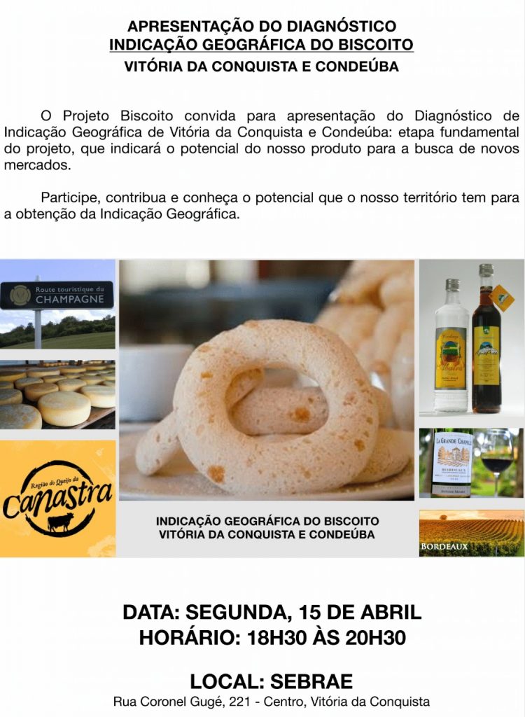 Vitória da Conquista – Na próxima segunda-feira, 15, acontece a apresentação do diagnóstico da Indicação Geográfica (IG) de Vitória da Conquista e Condeúba para os biscoitos caseiros produzidos na região. A apresentação vai mostrar o potencial para obtenção do selo de IG do produto típico local. O evento acontece no auditório do Sebrae em Vitória da Conquista, localizado na Rua Coronel Gugé, 221, Centro, a partir das 18h30.