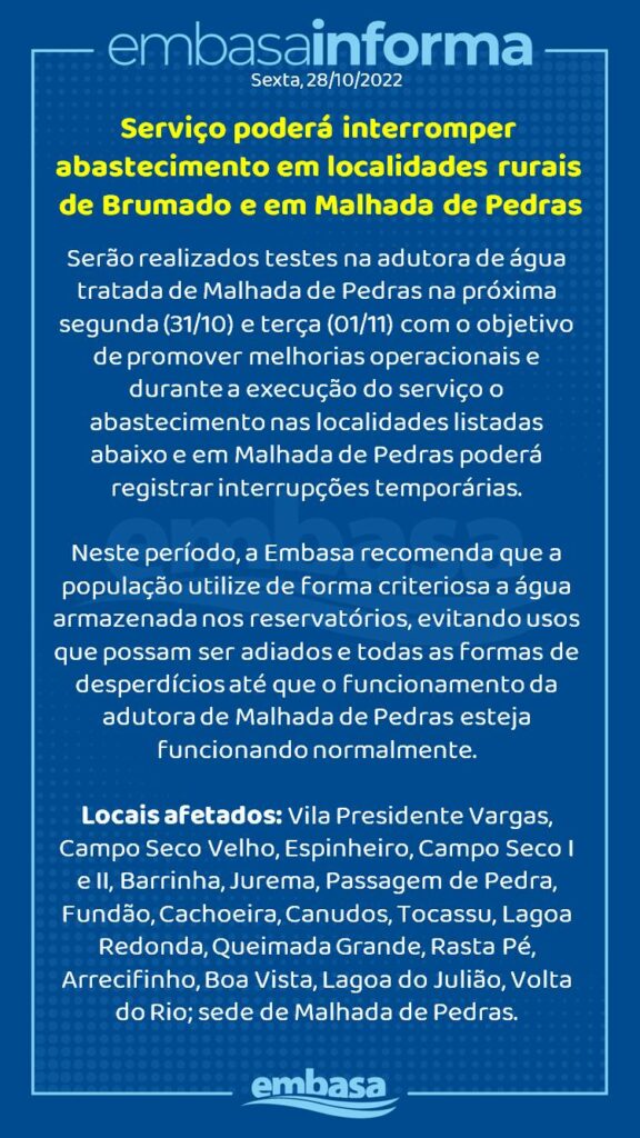 A Empresa Baiana de Águas e Saneamento (Embasa) informa que realizará testes na adutora de água tratada de Malhada de Pedras na próxima segunda (31/10) e terça (01/11) com o objetivo de promover melhorias operacionais. Durante a execução do serviço o abastecimento nas localidades listadas abaixo e na cidade de Malhada de Pedras poderá registrar interrupções temporárias.