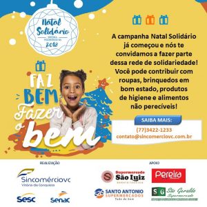Em parceria com o Sincomércio [Sindicato de Comércio Varejista e Atacadista de Vitória da Conquista] e Senac [Serviço Nacional de Aprendizagem Comercial], com a Campanha “Natal Solidário” o Sesc busca arrecadar roupas, brinquedos em bom estado, produtos de higiene e alimentos não perecíveis. Os interessados em realizar doações podem se dirigir aos seguintes locais: à sede do Sincomércio e do Senac, localizada na Rua 10 de Novembro, 720, no Bairro Recreio; ao SESC, que fica na Avenida Anel do Contorno Rodoviário, no Bairro Ibirapuera; ao Supermercado São Geraldo, localizado na Avenida Presidente Vargas, 258, Bairro Alto Maron; ao Pereira Supermercado, que fica na Rua Dois de Janeiro, 620, também no Alto Maron e ao Supermercado São Luiz, localizado na Avenida Lapa, 2886, no Bairro Brasil.