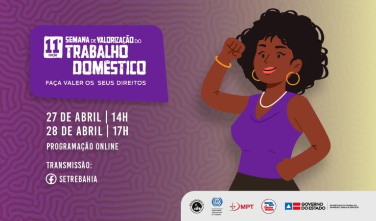 A 11ª Semana de Valorização do Trabalho Doméstico acontece nesta terça e quarta-feira (27 e 28 de abril), de forma virtual, com uma programação composta por painel temático, roda de conversa e apresentações de estudos e projetos. O evento é uma realização da Secretaria do Trabalho, Emprego, Renda e Esporte (Setre) e marca as comemorações do Dia Nacional da Trabalhadora e do Trabalhador Doméstico, celebrado em 27 de abril.