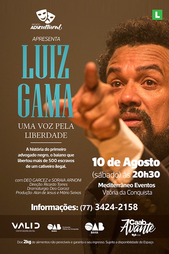 A Caixa de Assistência dos Advogados do Estado da Bahia (CAAB) através do Projeto ADVCultural, em parceria com a Ordem dos Advogados do Brasil (OAB) Subseção Vitória da Conquista, apresenta: LUIZ GAMA – Uma voz pela liberdade. Uma biografia dramatizada sobre a história do primeiro advogado negro, o baiano e abolicionista que libertou mais de 500 escravos de um cativeiro ilegal. O espetáculo compõe a programação que a CAAB preparou para homenagear o Dia do Advogado, celebrado em 11 de agosto. Serão três apresentações na Bahia, em Vitória da Conquista o evento ocorrerá no dia 10 de agosto, às 20h30, no Mediterrâneo Complexo para Eventos. Em seguida, ocorrerá o Baile da Advocacia 2019, a tradicional confraternização da classe é por adesão e a OAB já disponibiliza ingressos na sede da Subseção.