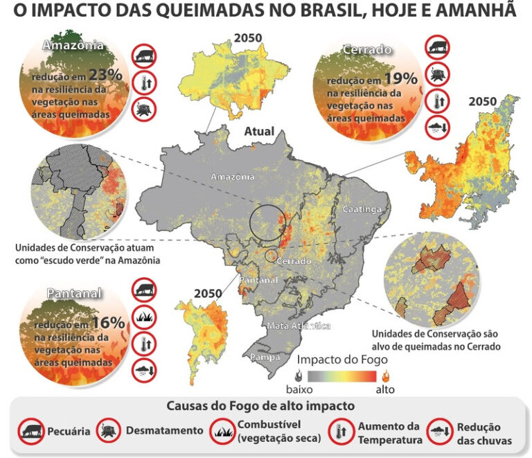 Ao mesmo tempo, as Unidades de Conservação no Cerrado são sistematicamente alvo de incêndios criminosos, registrando, frequentemente, grandes queimadas apesar da presença de brigadas e de programas de prevenção de fogo em algumas delas. Na Amazônia, as queimadas estão inerentemente relacionadas ao desmatamento ao longo da fronteira agrícola. Contudo, suas Unidades de Conservação e Terras Indígenas são ainda pouco afetadas pelos incêndios de grande impacto, funcionando como um “escudo verde”, mesmo diante da carência de fiscalização.
