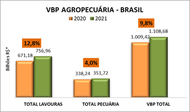 O Valor Bruto da Produção Agropecuária (VBP) deste ano está estimado em R$ 1,109 trilhão, 9,8% superior ao do ano passado (R$ 1,099 trilhão), com base nos cálculos atualizados em julho. As lavouras representam R$ 757 bilhões, 12,8% acima do valor de 2020, e a pecuária, 352 bilhões, maior 4% em relação ao ano passado.