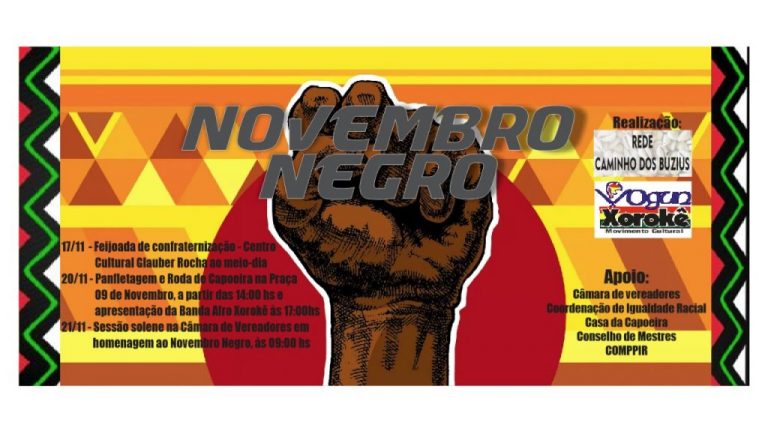 O evento começa com uma boa feijoada de confraternização. O almoço acontece nesse sábado (17) no Centro Glauber Rocha. No Dia Nacional da Consciência Negra (20), das 14h às 18h, haverá roda de capoeira, panfletagem e outras ações. A Banda Afro Xoroquê encerra a programação que acontece na Praça 9 de novembro.