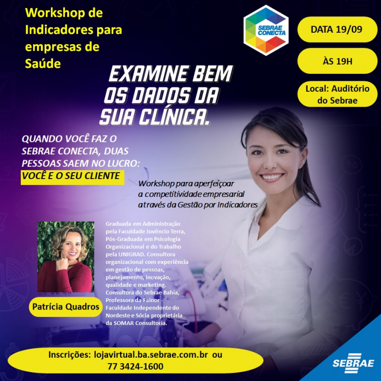 O Workshop de Indicadores de Resultados para Segmento Saúde acontece no dia 19 de setembro, no Auditório do Sebrae, às 19h. As inscrições são gratuitas, estão abertas e podem ser realizadas pelo site www.lojavirtual.ba.sebrae.com.br ou pelo telefone (77) 3424-1600. As vagas são limitadas.
